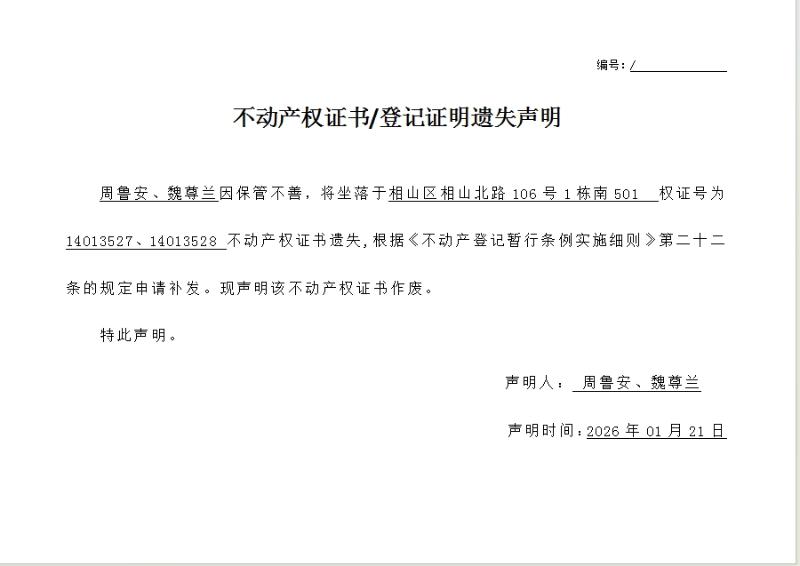周鲁安、魏尊兰不动产权证书/登记证明遗失声明