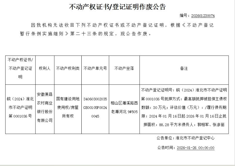 安徽萧县农村商业银行股份有限公司不动产权证书/登记证明作废公告