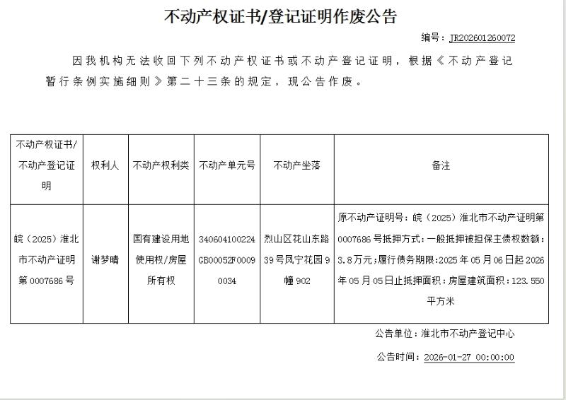 谢梦晴不动产权证书/登记证明作废公告