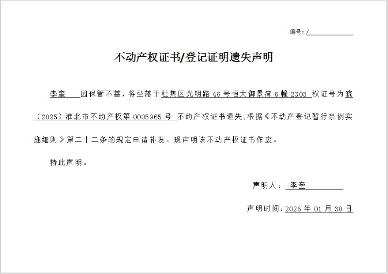 李奎不动产权证书/登记证明遗失声明