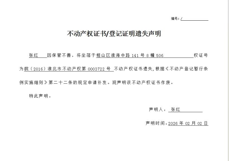 张红不动产权证书/登记证明遗失声明