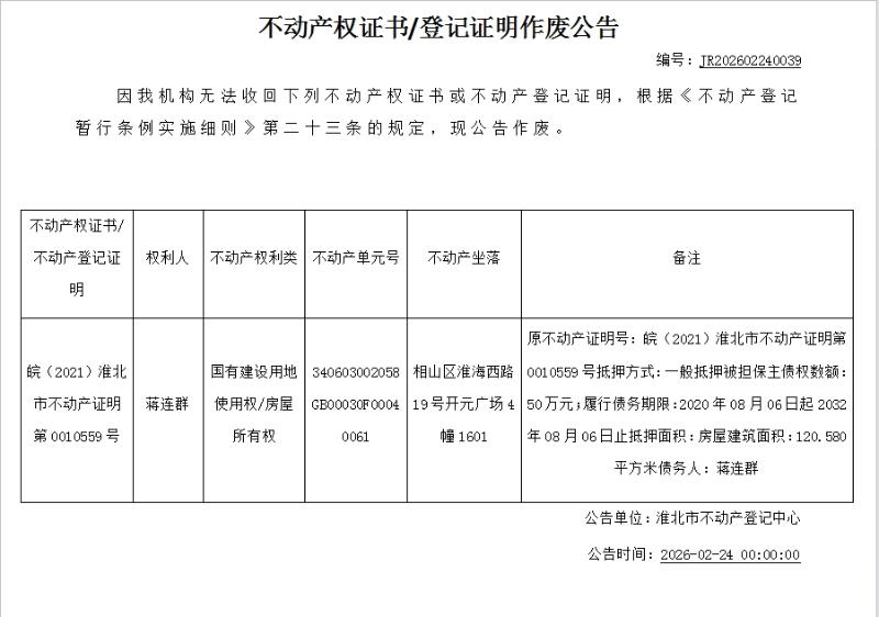 蒋连群不动产权证书/登记证明作废公告