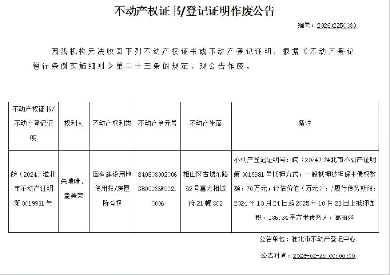 朱晴晴、孟美荣不动产权证书/登记证明作废公告