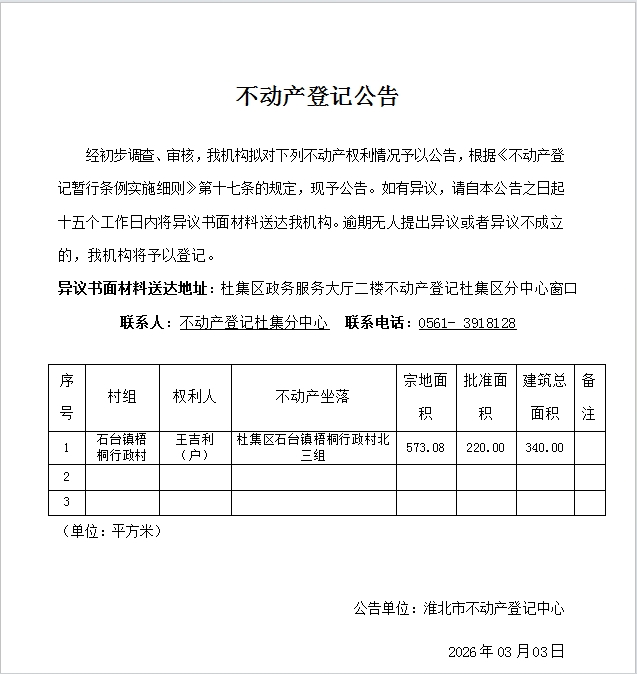 王吉利(户)不动产登记公告