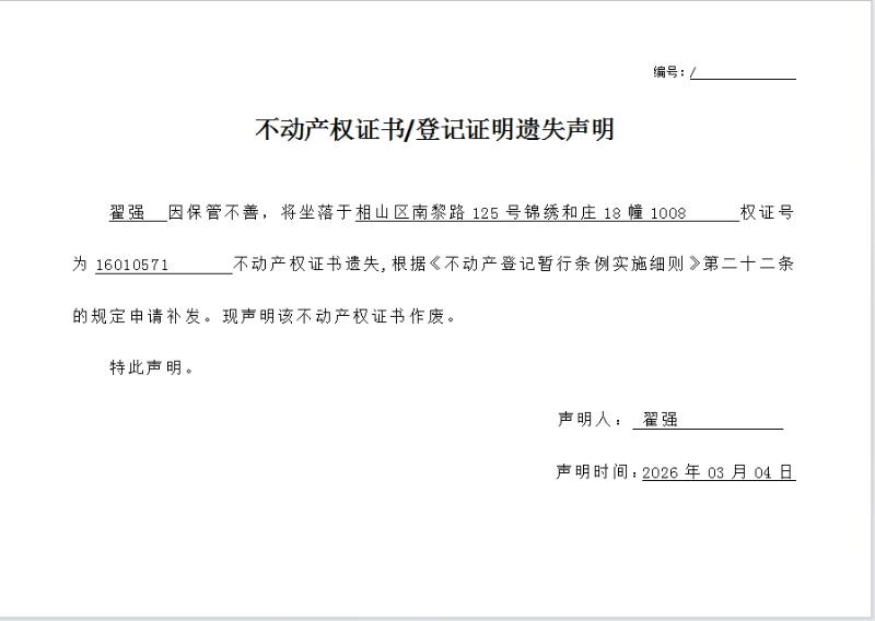 翟强不动产权证书/登记证明遗失声明