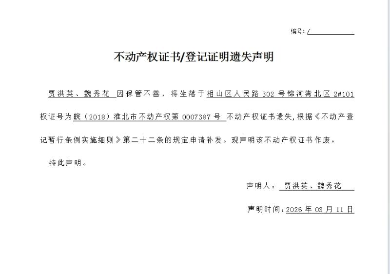 贾洪英、魏秀花不动产权证书/登记证明遗失声明