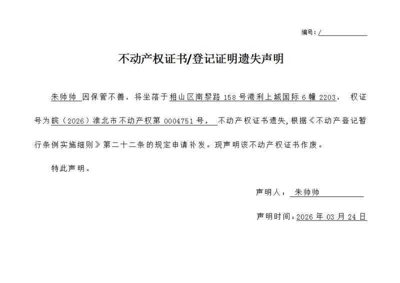 朱帅帅不动产权证书/登记证明遗失声明
