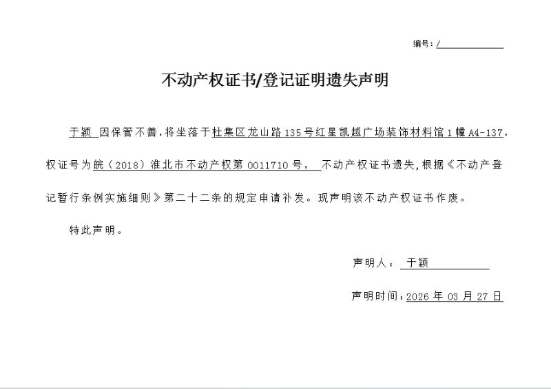 于颖不动产权证书/登记证明遗失声明