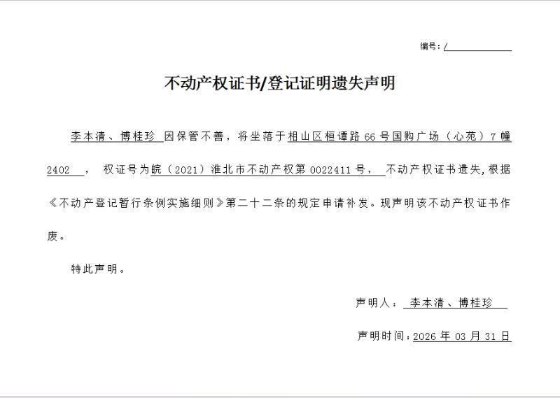 李本清、博桂珍不动产权证书/登记证明遗失声明