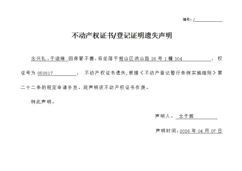 念兴礼、于淑琳不动产权证书/登记证明遗失声明