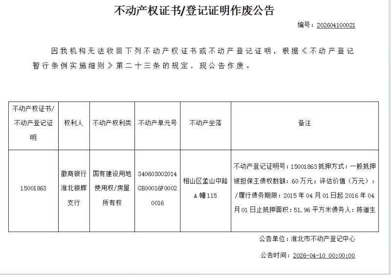 徽商银行淮北银辉支行不动产权证书/登记证明作废公告