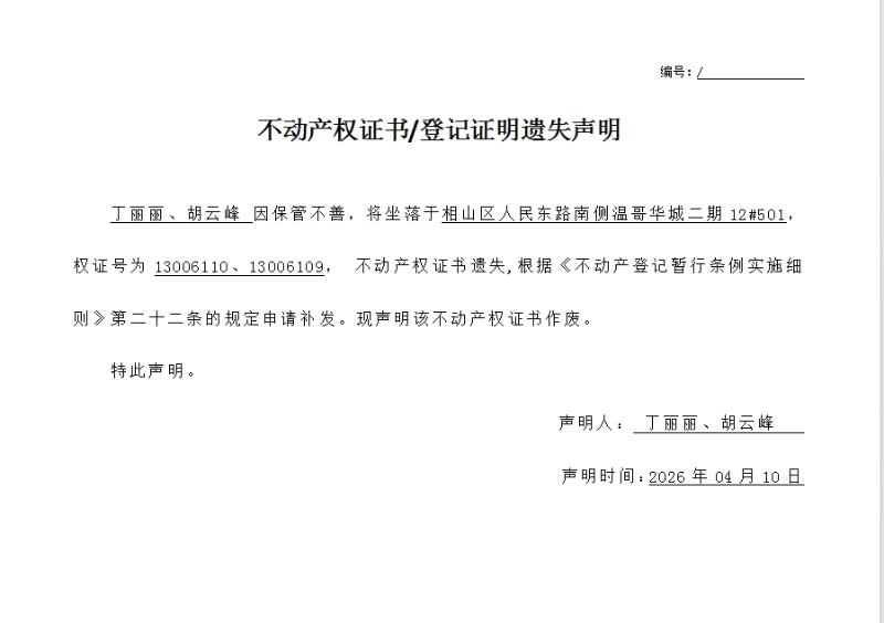 丁丽丽、胡云峰不动产权证书/登记证明遗失声明