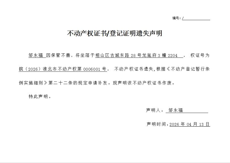 邹永福不动产权证书/登记证明遗失声明