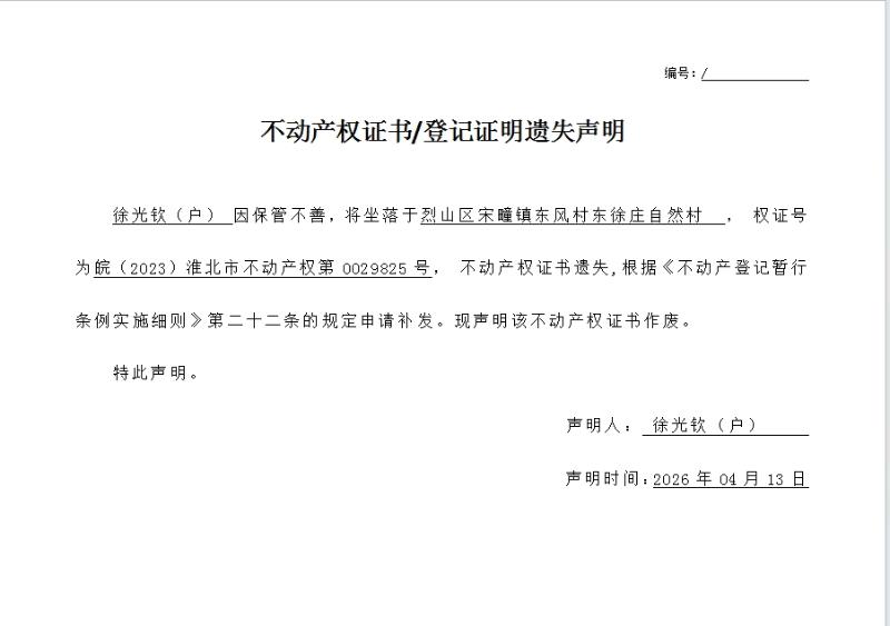 徐光钦(户)不动产权证书/登记证明遗失声明