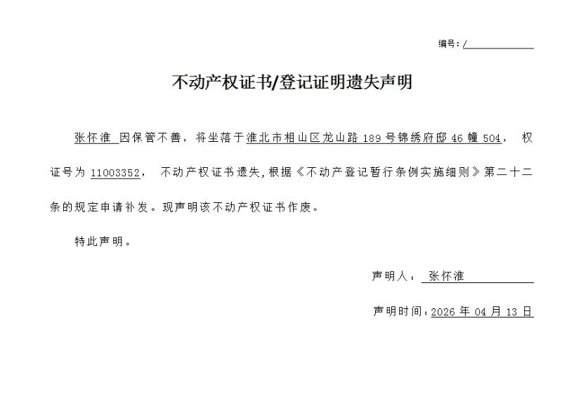 张怀淮不动产权证书/登记证明遗失声明