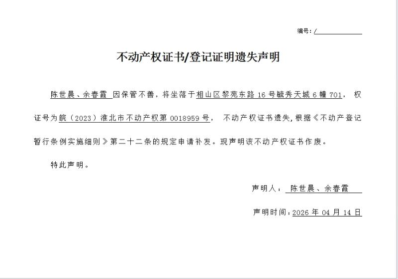 陈世晨、余春霞不动产权证书/登记证明遗失声明