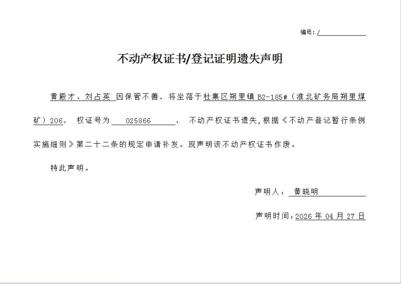 黄殿才、刘占英不动产权证书/登记证明遗失声明