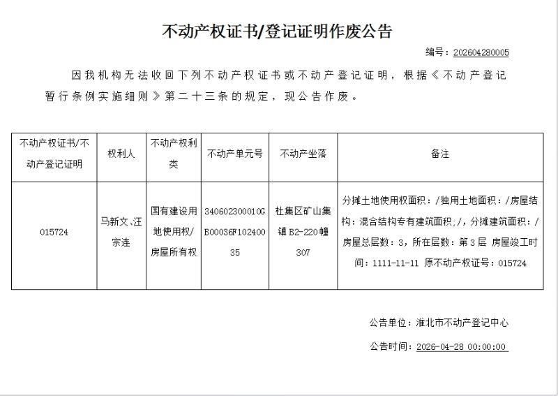 马新文、汪宗连不动产权证书/登记证明作废公告
