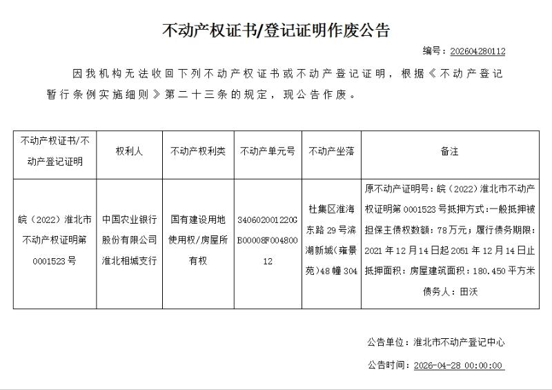 中国农业银行股份有限公司淮北相城支行不动产权证书/登记证明作废公告