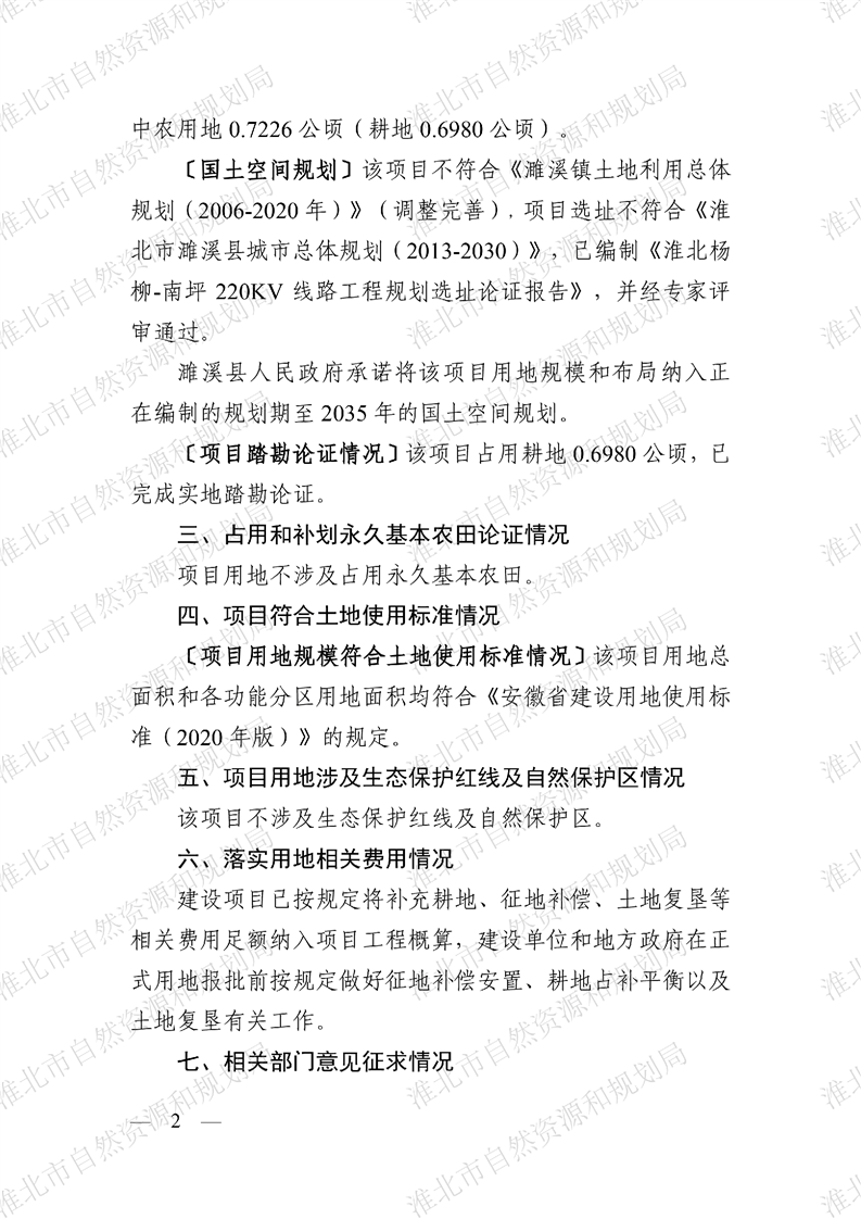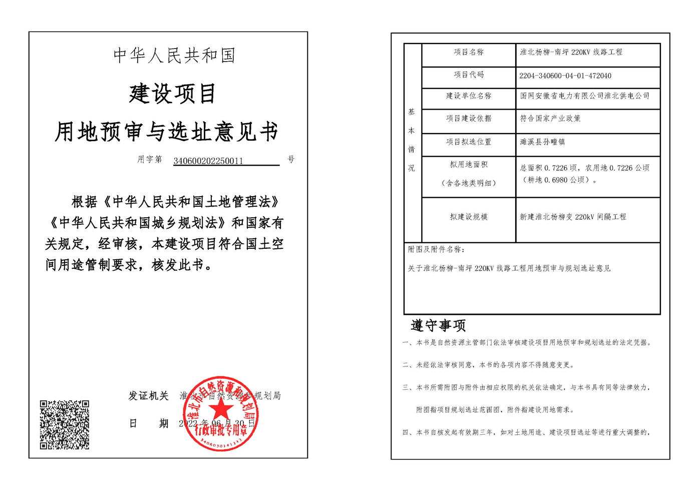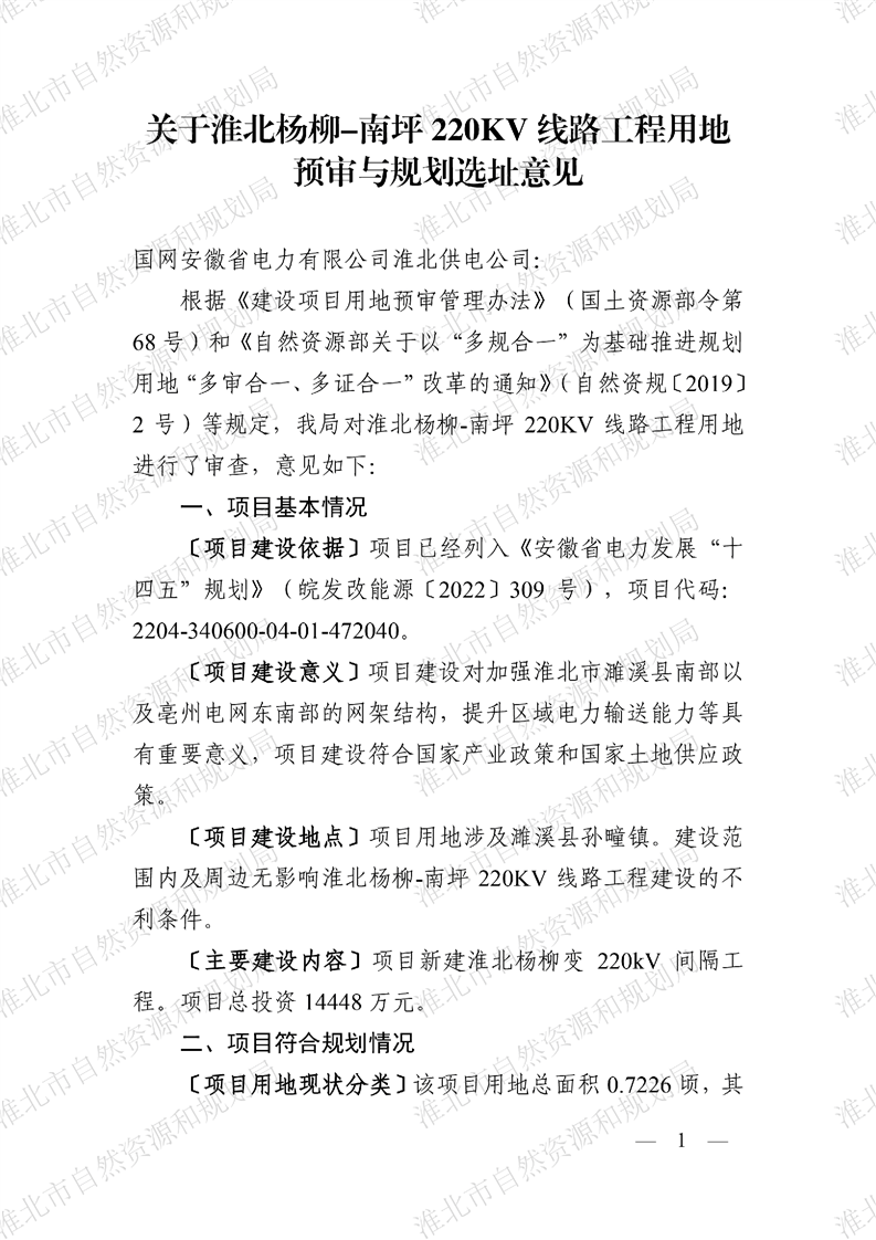 淮北杨柳-南坪220KV线路工程用地预审与规划选址意见书