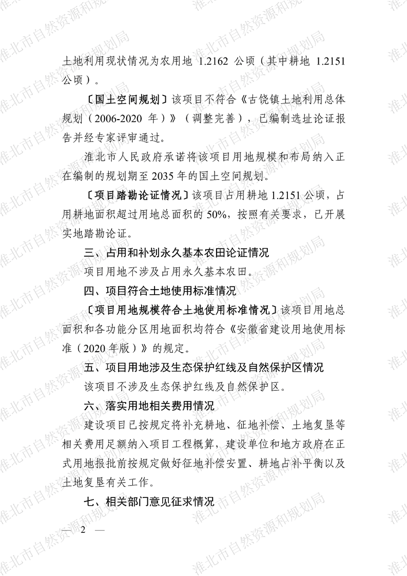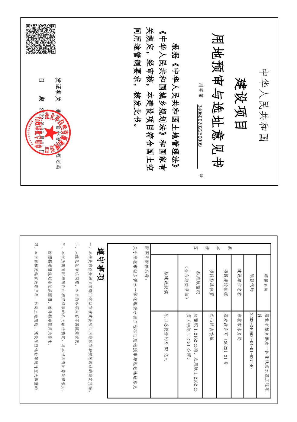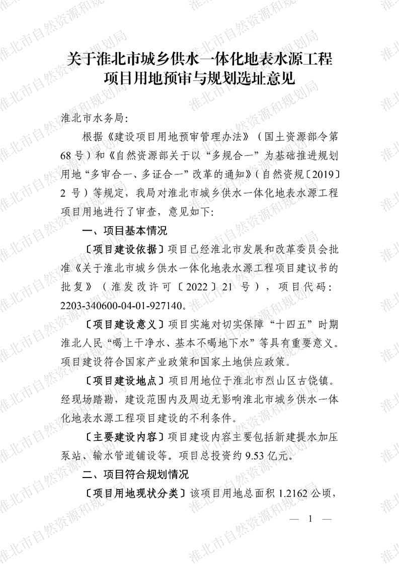 淮北市城乡供水一体化地表水源工程项目用地预审与规划选址意见书