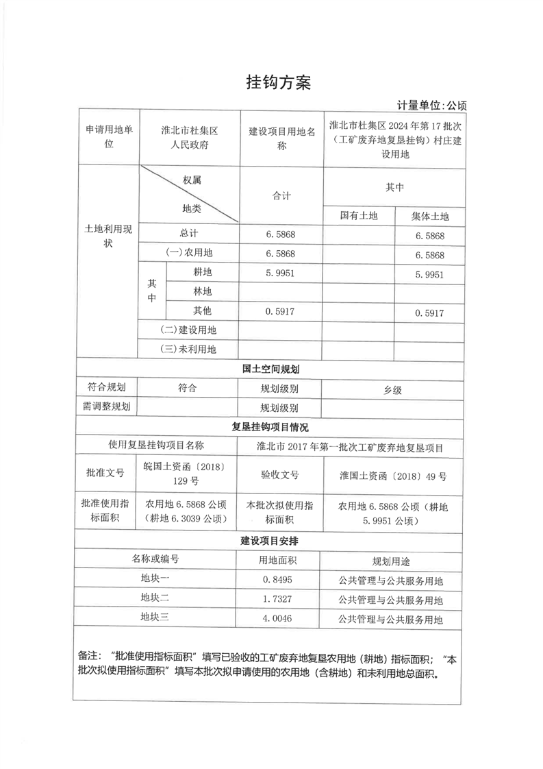 关于淮北市杜集区2024年第17批次(工矿废弃地复垦挂钩)村庄建设用地(工矿废弃地复垦挂钩建设用地呈报挂钩方案)