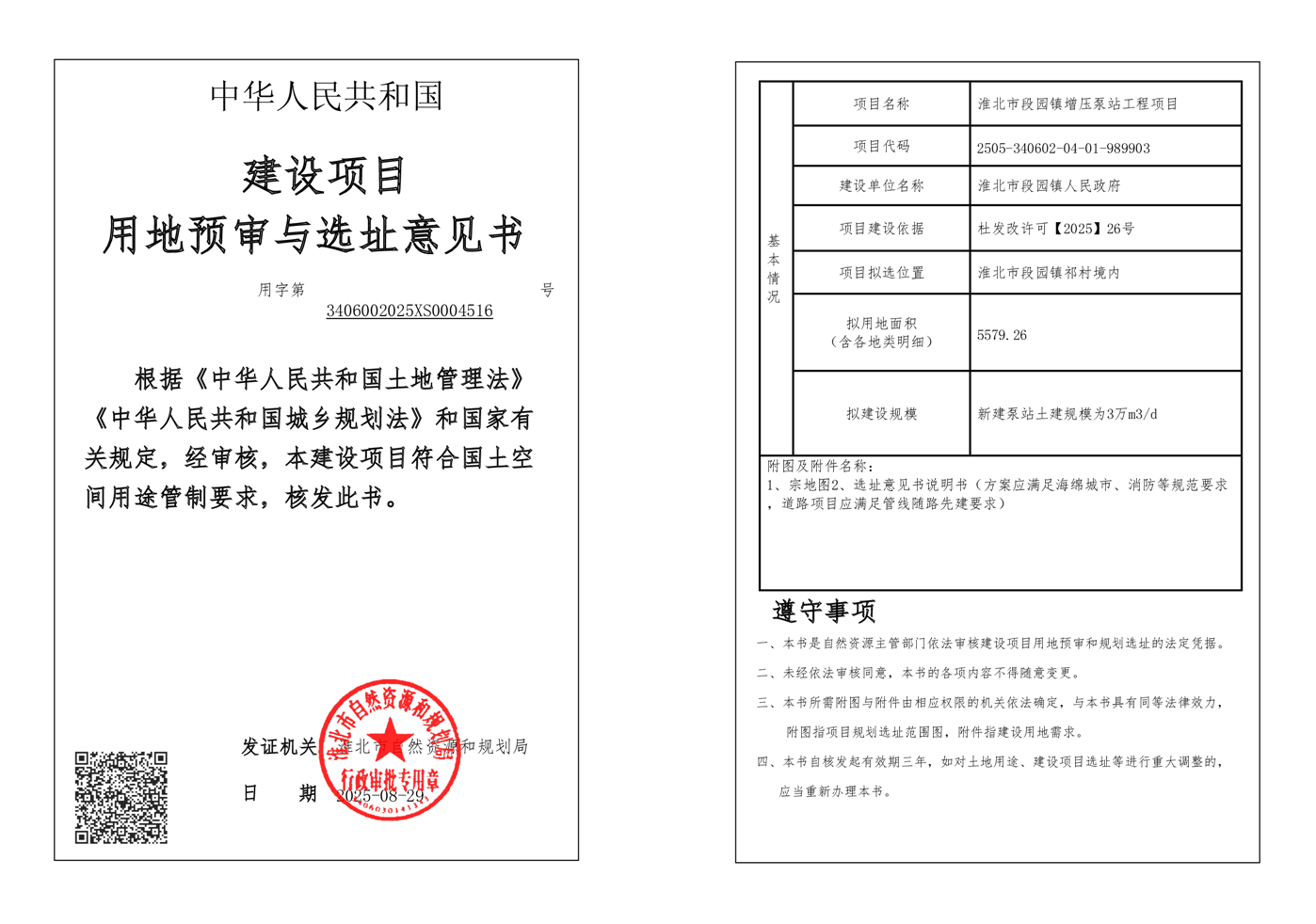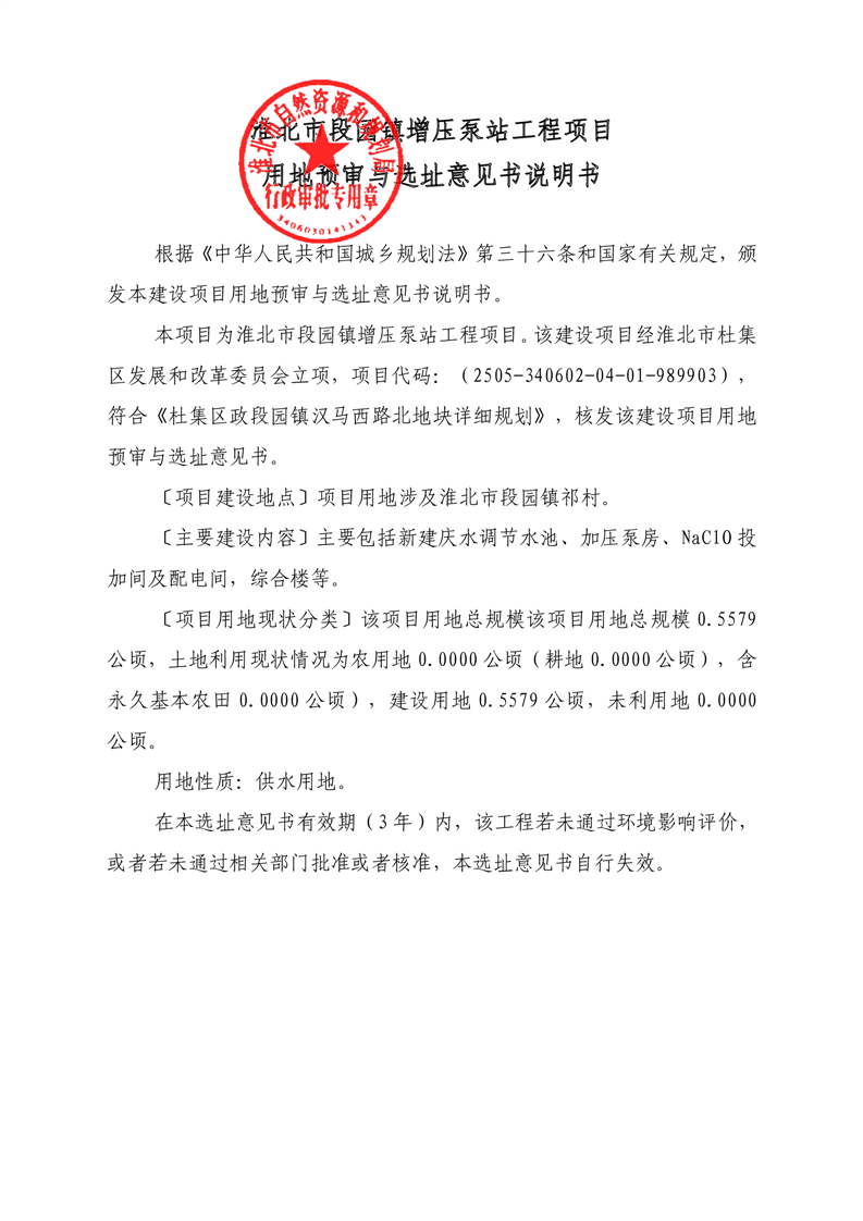 淮北市段园镇增压泵站项目选址意见书公示 |