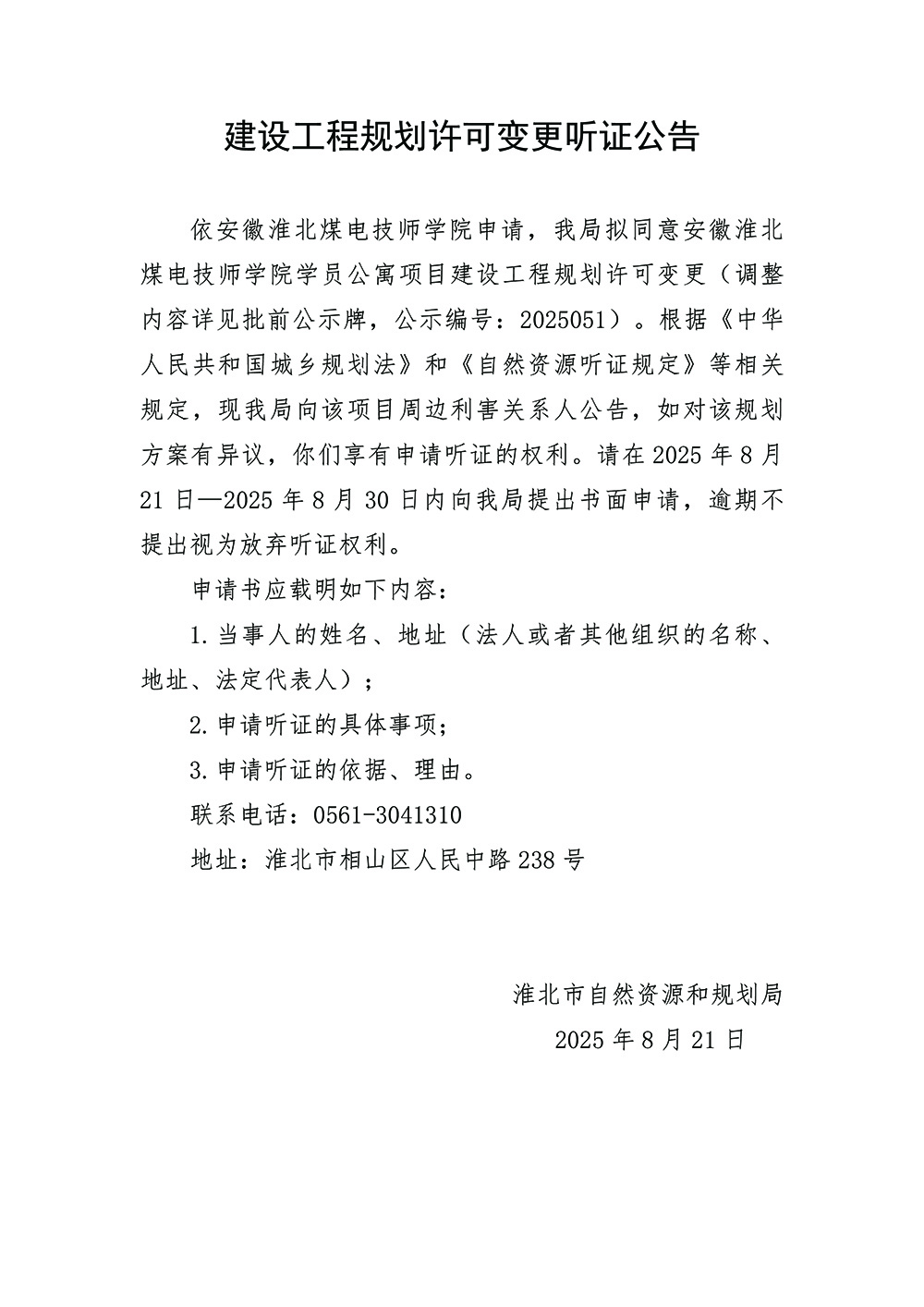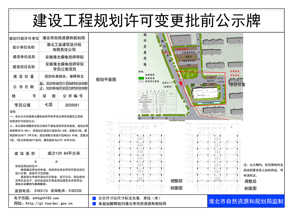 安徽淮北煤电技师学院学员公寓项目建设工程规划许可变更批前公示