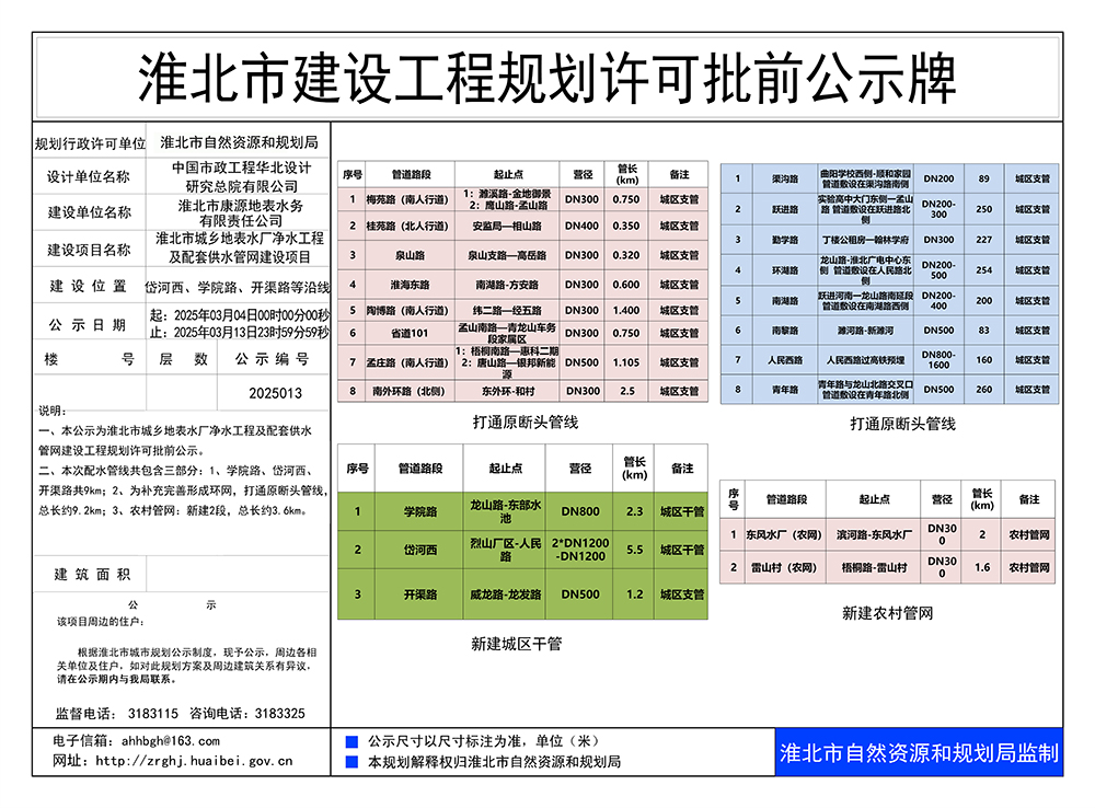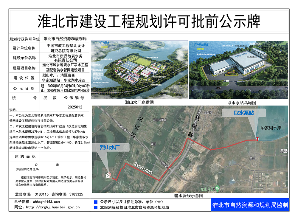 淮北市城乡地表水厂净水工程及配套供水管网建设项目工程规划许可批前公示