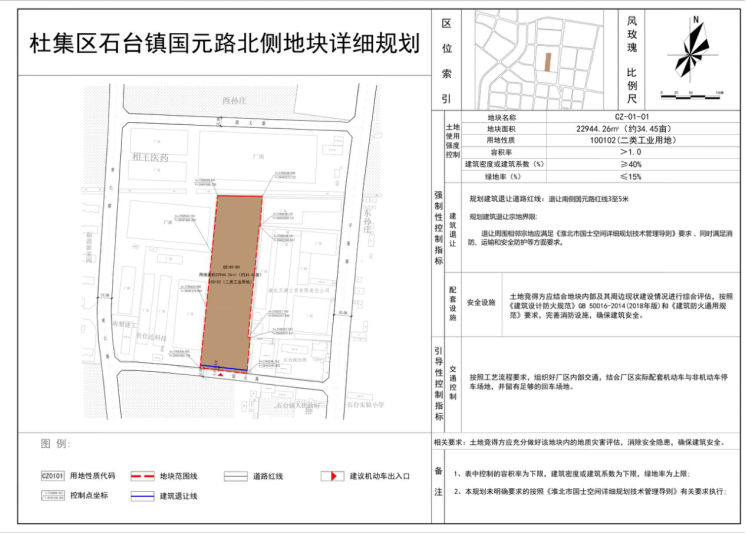 该地块用地面积约34.45亩,规划用地性质为二类工业用地,容积率>1.0,建筑密度或建筑系数≥40%,绿地率≤15%。土地竞得方应结合地块内部及其周边现状建设情况进行综合评估,按照《建筑设计防火规范》GB 50016-2014(2018年版)和《建筑防火通用规范》要求,完善消防设施,确保建筑安全。