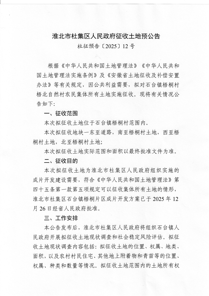 淮北市杜集区人民政府征收土地预公告(杜征预告〔2025〕12号)