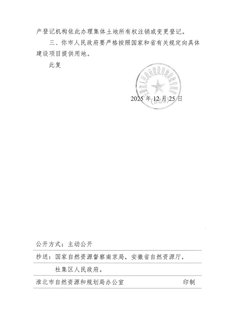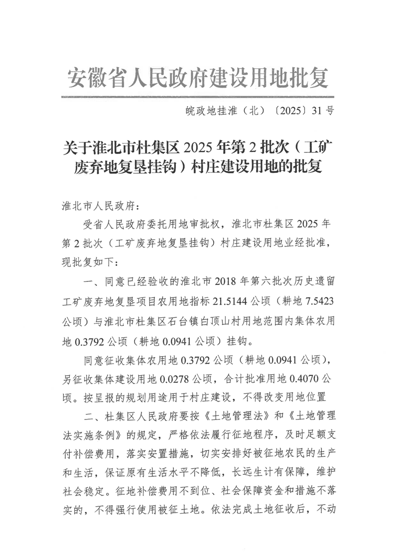 关于淮北市杜集区2025年第2批次(工矿废弃地复垦挂钩)村庄建设用地的批复