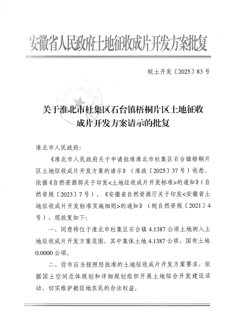 淮北市杜集区石台镇梧桐片区土地征收成片开发方案请示的批复