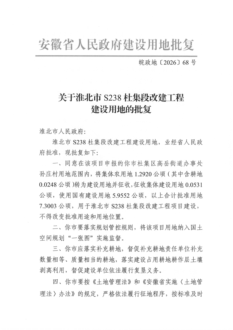 关于淮北市S238杜集段改建工程建设用地的批复 |